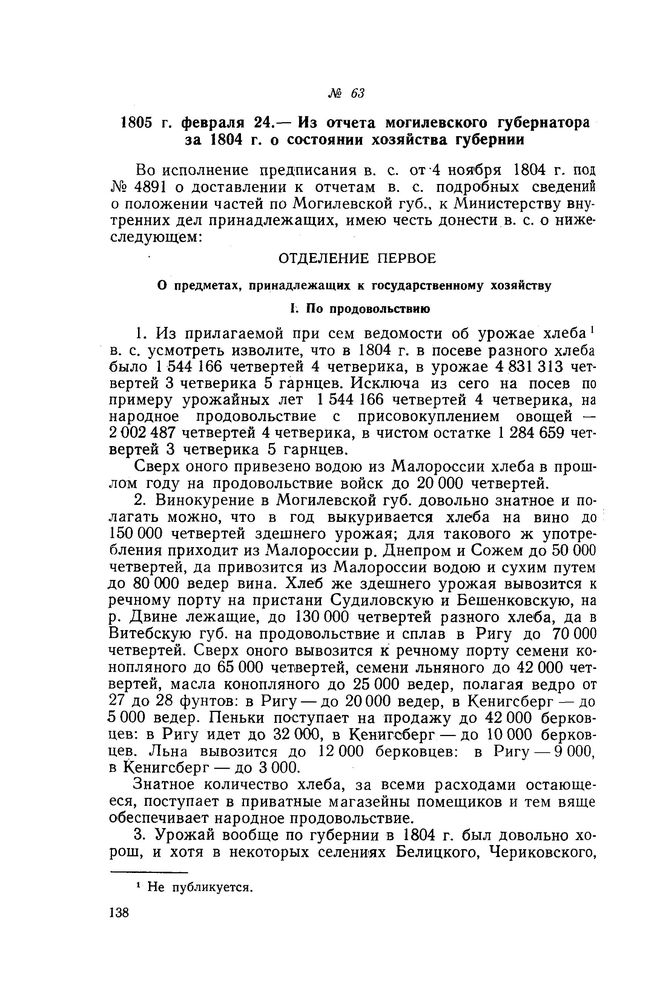 Особо следует отметить извлечения, взятые из отчётов губернаторов, а также выписки из журналов, протоколов различных правительственных учреждений. В группе этих документов опущенный текст обозначен многоточием, но не оговорен. Вследствие неудобства публикации громоздких годовых отчётов губернаторов полностью из них взяты извлечения, относящиеся к тому или иному вопросу. Из журналов и протоколов взят только тот текст, который относится к теме публикации и касается территории Белоруссии.