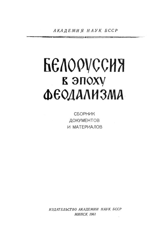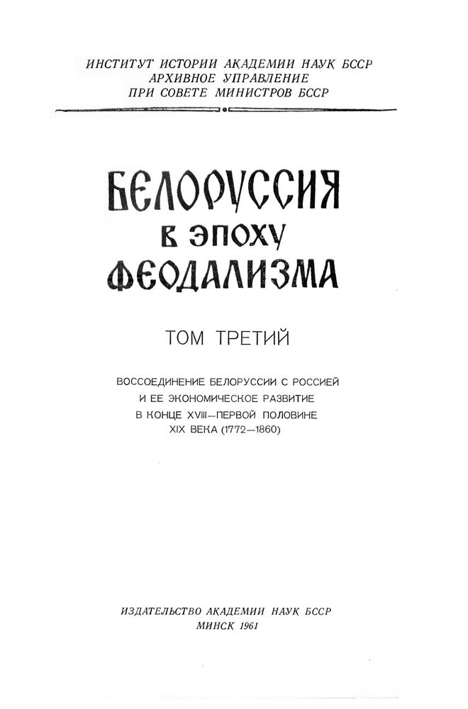 Сборник документов и материалов «Белоруссия в эпоху феодализма» (т. III) охватывает период истории Белоруссии от воссоединения с Россией до реформы 1861 года.