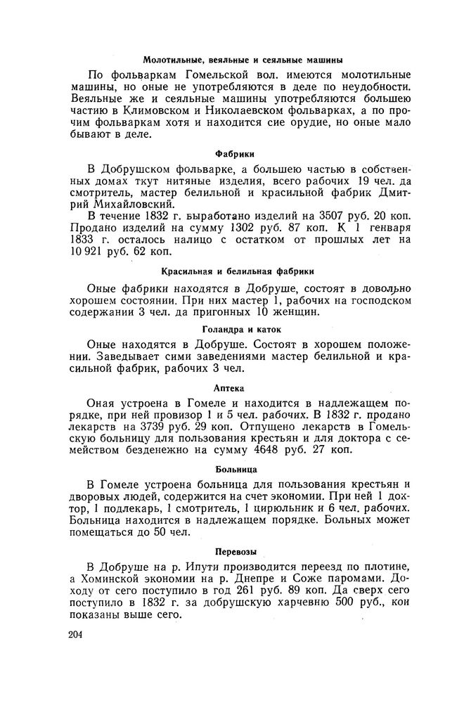 В Гомеле устроена больница для пользования крестьян и дворовых людей, содержится на счет экономии. При ней 1 доктор, 1 подлекарь, 1 смотритель, 1 цирюльник и б чел. рабочих. Больница находится в надлежащем порядке. Больных может помещаться до 50 чел.