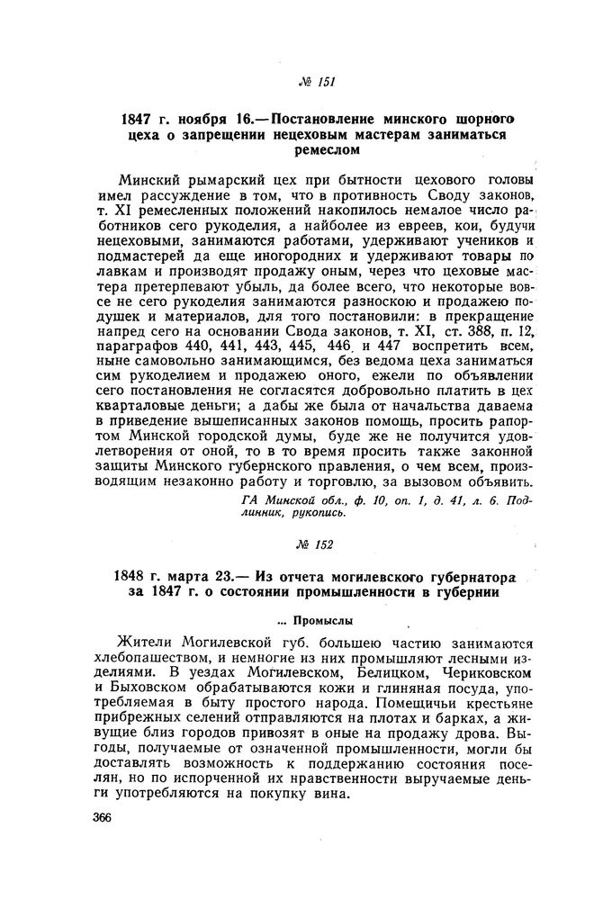Однако материалы раздела позволяют вместе с тем внести известные коррективы в установившееся до сего времени в исторической литературе (в частности, в «Истории БССР», т. I, изд. 1953 г.) мнение о том, что уже во второй четверти XIX века в Белоруссии капиталистическая мануфактура вытеснила вотчинные предприятия, а вольнонаемный труд получил преобладание в промышленности. Как видно из документов, здесь вплоть до реформы 1861 года преобладал крепостной труд. Хотя многие мелкие помещичьи предприятия закрывались, не выдерживая конкуренции с капиталистической мануфактурой и с крупными помещичьими предприятиями, однако в целом нет оснований говорить об упадке вотчинных предприятий.