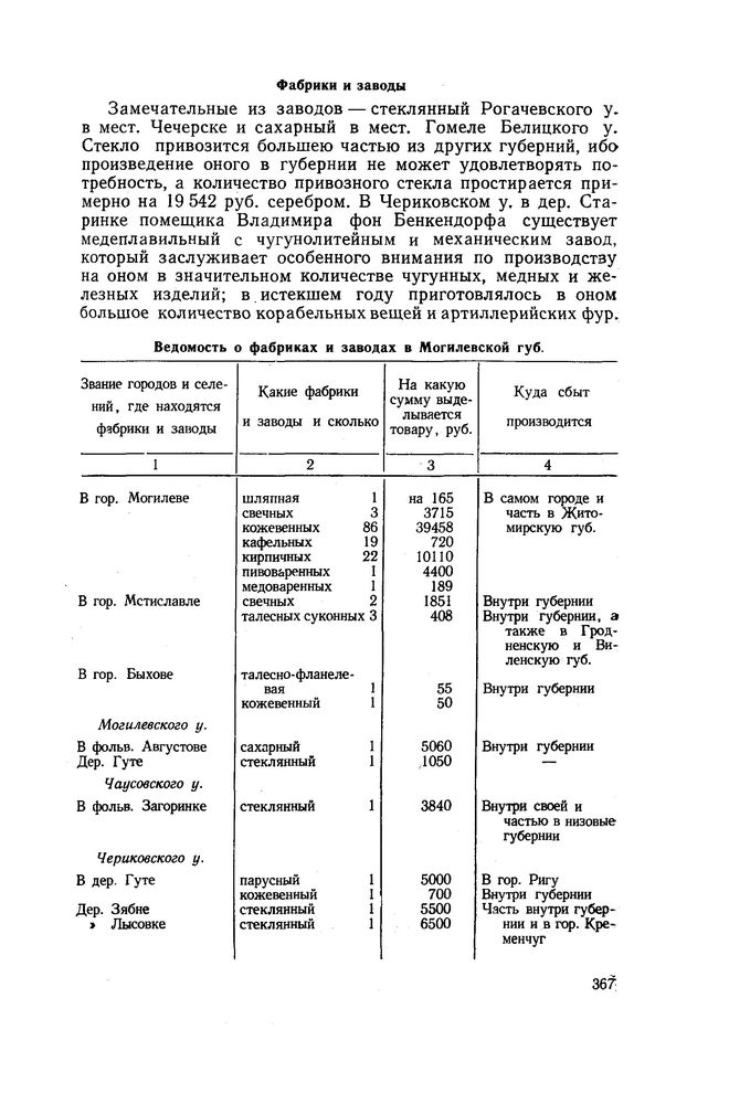 Замечательные из заводов — стеклянный Рогачевского у. в мест. Чечерске и сахарный в мест. Гомеле Белицкого у. Стекло привозится большею частью из других губерний, ибо произведение оного в губернии не может удовлетворять потребность, а количество привозного стекла простирается примерно на 19 542 руб. серебром. В Чериковском у. в дер. Старинке помещика Владимира фон Бенкендорфа существует медеплавильный с чугунолитейным и механическим завод, который заслуживает особенного внимания по производству на оном в значительном количестве чугунных, медных и железных изделий; в истекшем году приготовлялось в оном большое количество корабельных вещей и артиллерийских фур.