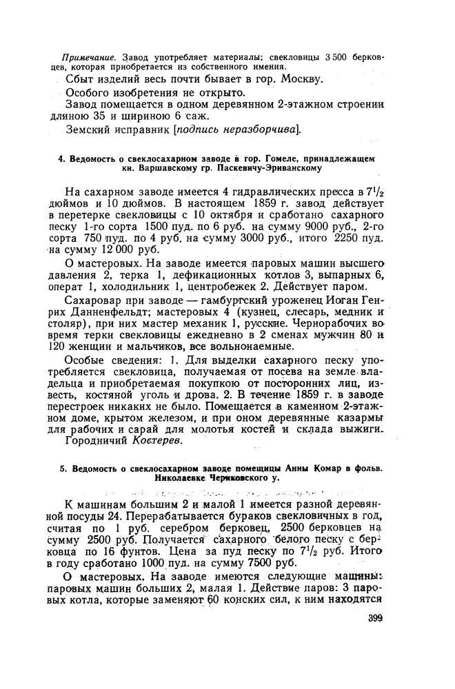 Особые сведения: 1. Для выделки сахарного песку употребляется свекловица, получаемая от посева на земле владельца и приобретаемая покупкою от посторонних лиц, известь, костяной уголь и дрова. 2. В течение 1859 г. в заводе перестроек никаких не было. Помещается в каменном 2-этаж-ном доме, крытом железом, и при оном деревянные казармы для рабочих и сарай для молотья костей и склада выжиги.