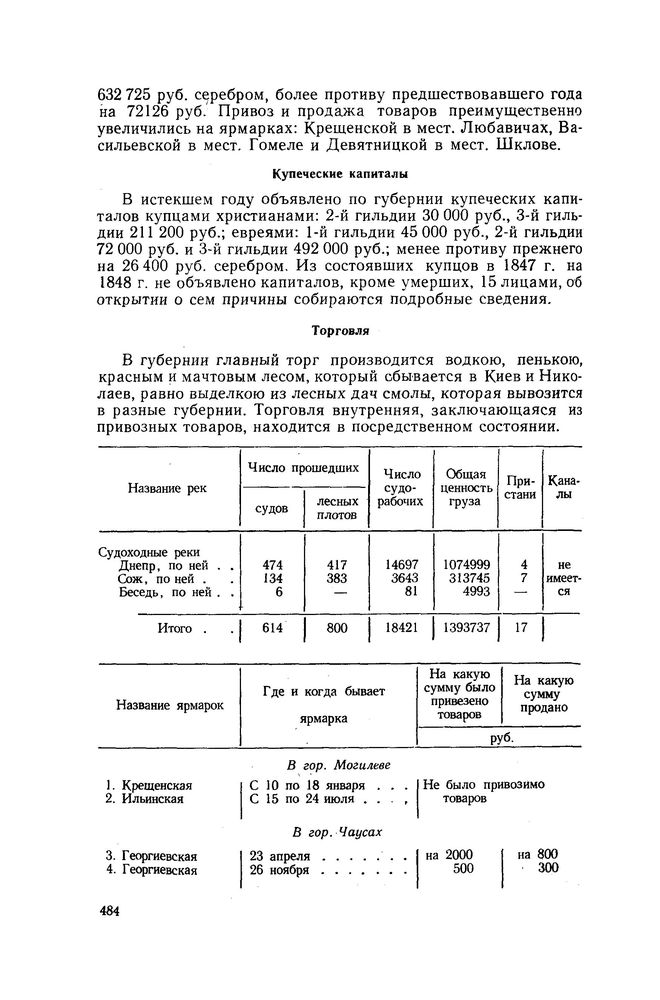 Ярмарок в губернии бывает 52, вновь открытых в минувшем году не было; общий оборот на всех ярмарках простирался до 632 725 руб. серебром, более противу предшествовавшего года на 72126 руб. Привоз и продажа товаров преимущественно увеличились на ярмарках: Крещенской в мест. Любавичах, Васильевской в мест. Гомеле и Девятницкой в мест. Шклове.