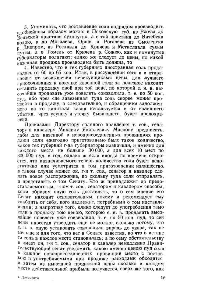 Правительствующий сенат слушали рапорты белорусского генерал-губернатора, генерал-фельдмаршала и кавалера гр. Захара Григорьевича Чернышева и директора соляного правления т. сов., сенатора и кавалера Михаила Яковлевича Маслова, коими изъясняют: что о том, что в новых провинциях торг иностранною солью оставлен вольным, учинены надлежащие объявления, а продажа казенной соли назначена в Могилевской губ. в 6 местах, и именно в провинциальных городах: Могилеве, Рогачеве, Орше, Мстиславле и в местечках Кричеве и Гомеле, в Псковской же губ. в 4 местах, т. е. в провинциальных городах: Полоцке, Витебске, Динабурге да в мест. Велиже. И соляного правления директор, сенатор и кавалер Михайло Яковлевич Маслов со своей стороны представляет:[…]